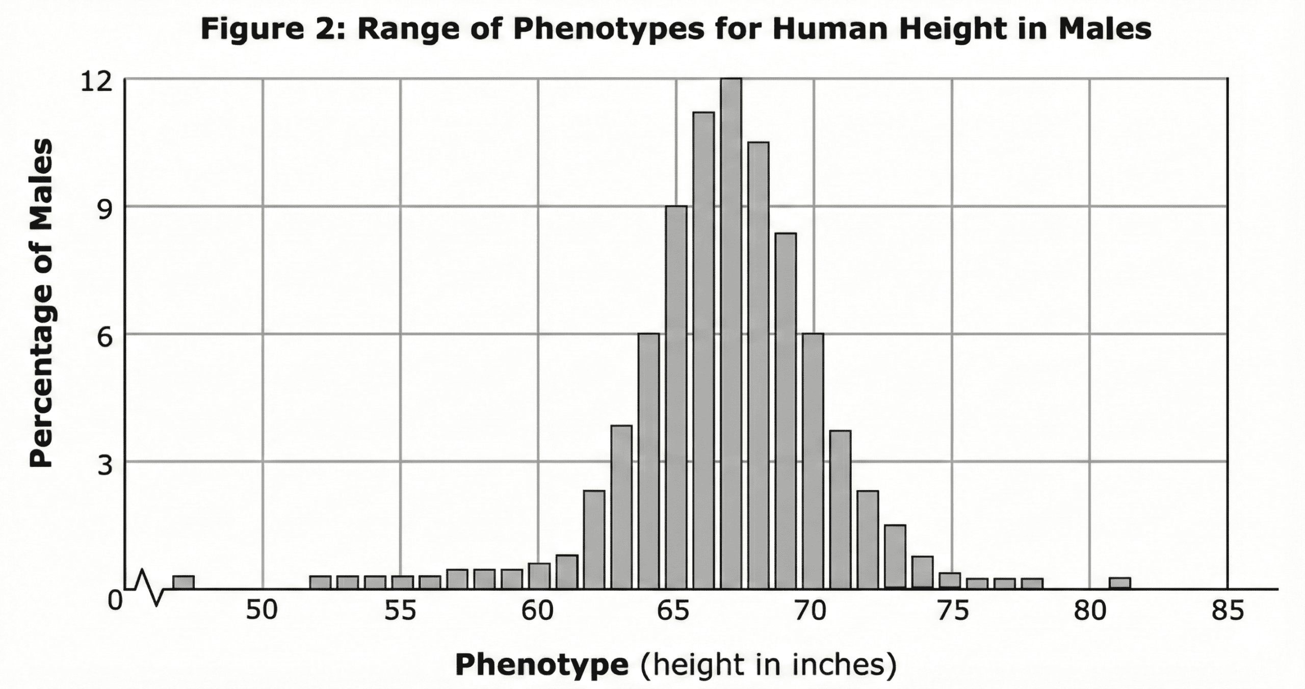 Figure 2 shows a continuous bell-shaped distribution of height. Traits that show a continuous range of phenotypes (rather than distinct categories like “tall” or “short”) are typically polygenic, meaning they are controlled by the interaction of multiple genes.