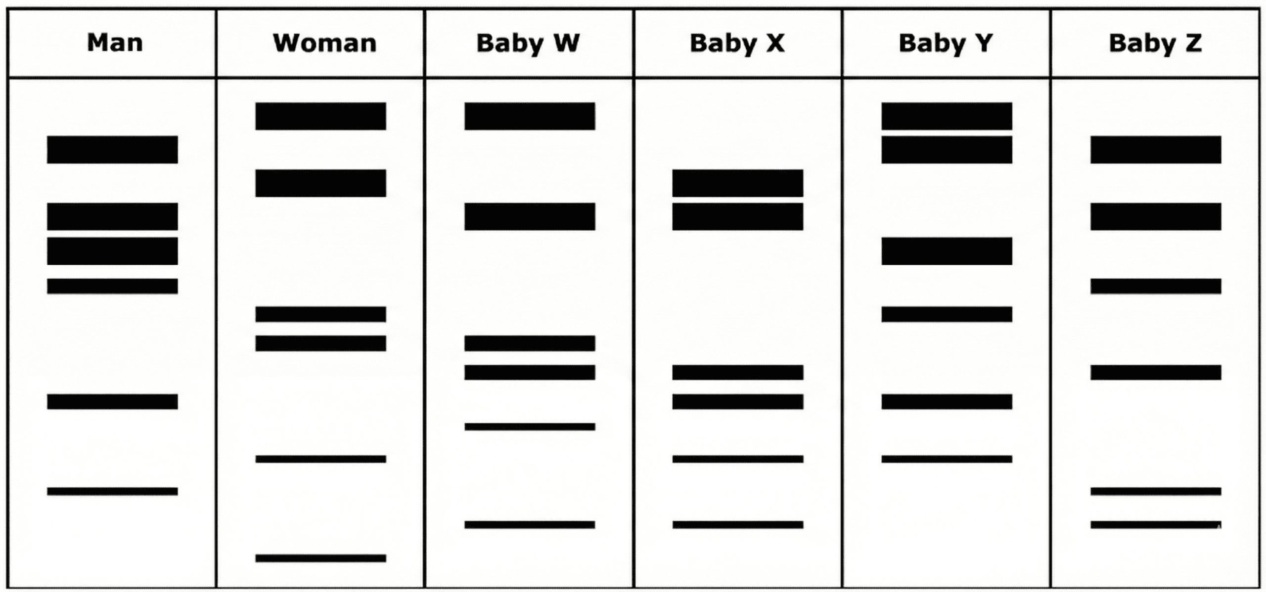 Other babies (W, X, and Z) possess unique bands that do not appear in either the Man or the Woman.