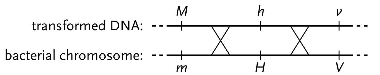 The bacterial chromosome starts with the alleles $m$, $H$, and $V$.