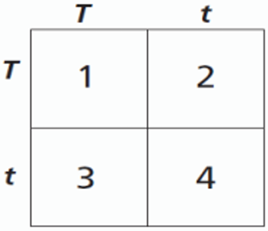 This produces genotypes: \(TT\) (homozygous dominant), \(2 \times Tt\) (heterozygous), and \(tt\) (homozygous recessive).