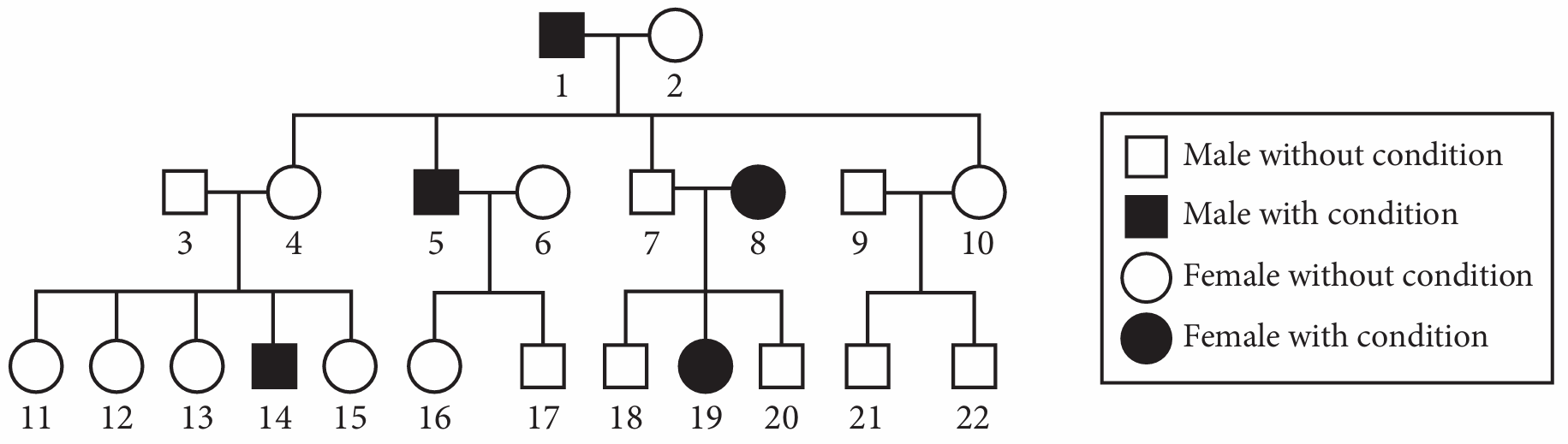 Therefore, the existence of affected females \(8\) and \(19\) (given their family context) provides the best evidence that the trait is autosomal, not sex-linked.