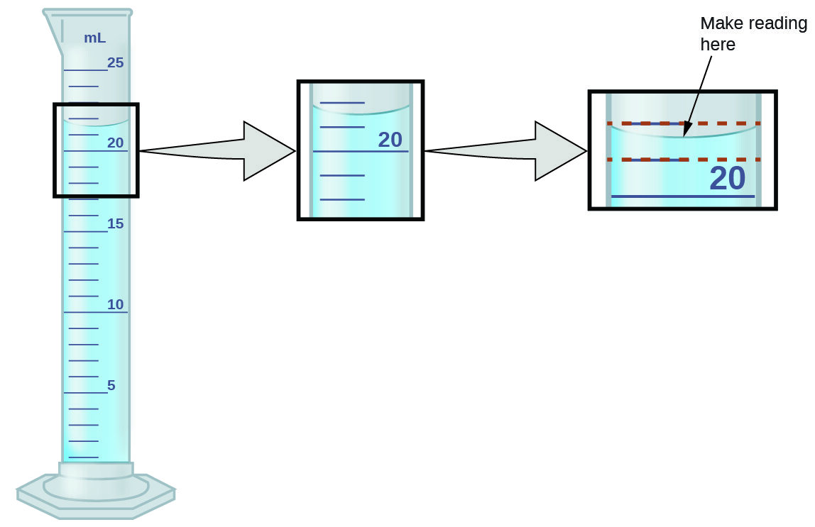 | Graduated cylinder | \( \mathrm{1\ mL} \) | \( \mathrm{36.7\ mL} \) |