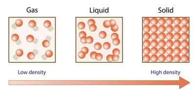 For a pure substance, particle mass is constant, so density differences come from particle spacing and arrangement.