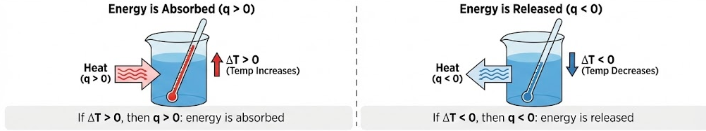 - If \( \mathrm{\Delta T > 0} \), then \( \mathrm{q > 0} \): energy is absorbed
