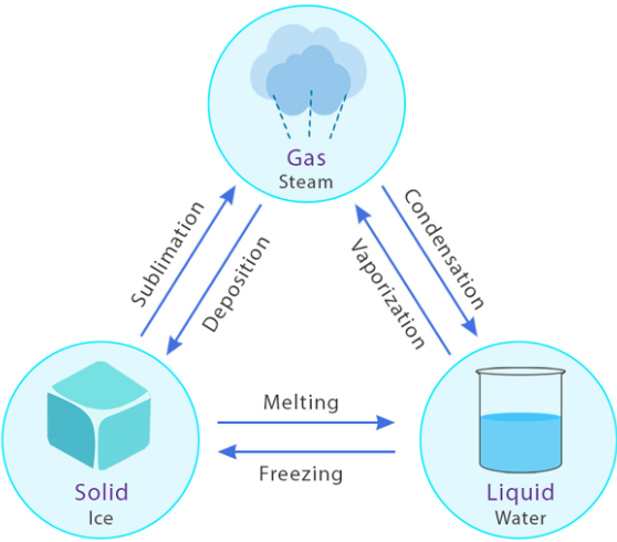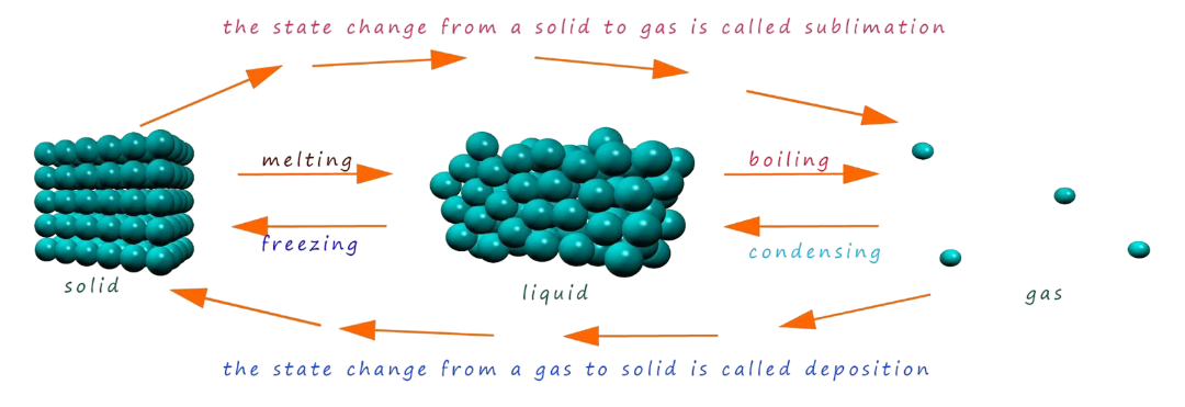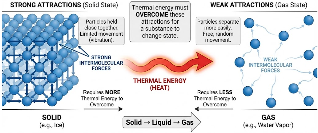 Changes in the state of matter (solid, liquid, gas) are closely related to the strength of attractions among particles. These attractions determine how easily particles can move apart when thermal energy is added.