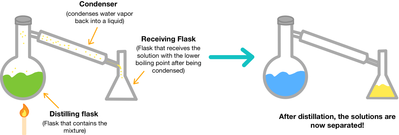 | Distillation | Different boiling points | Lower-boiling liquid is collected first |