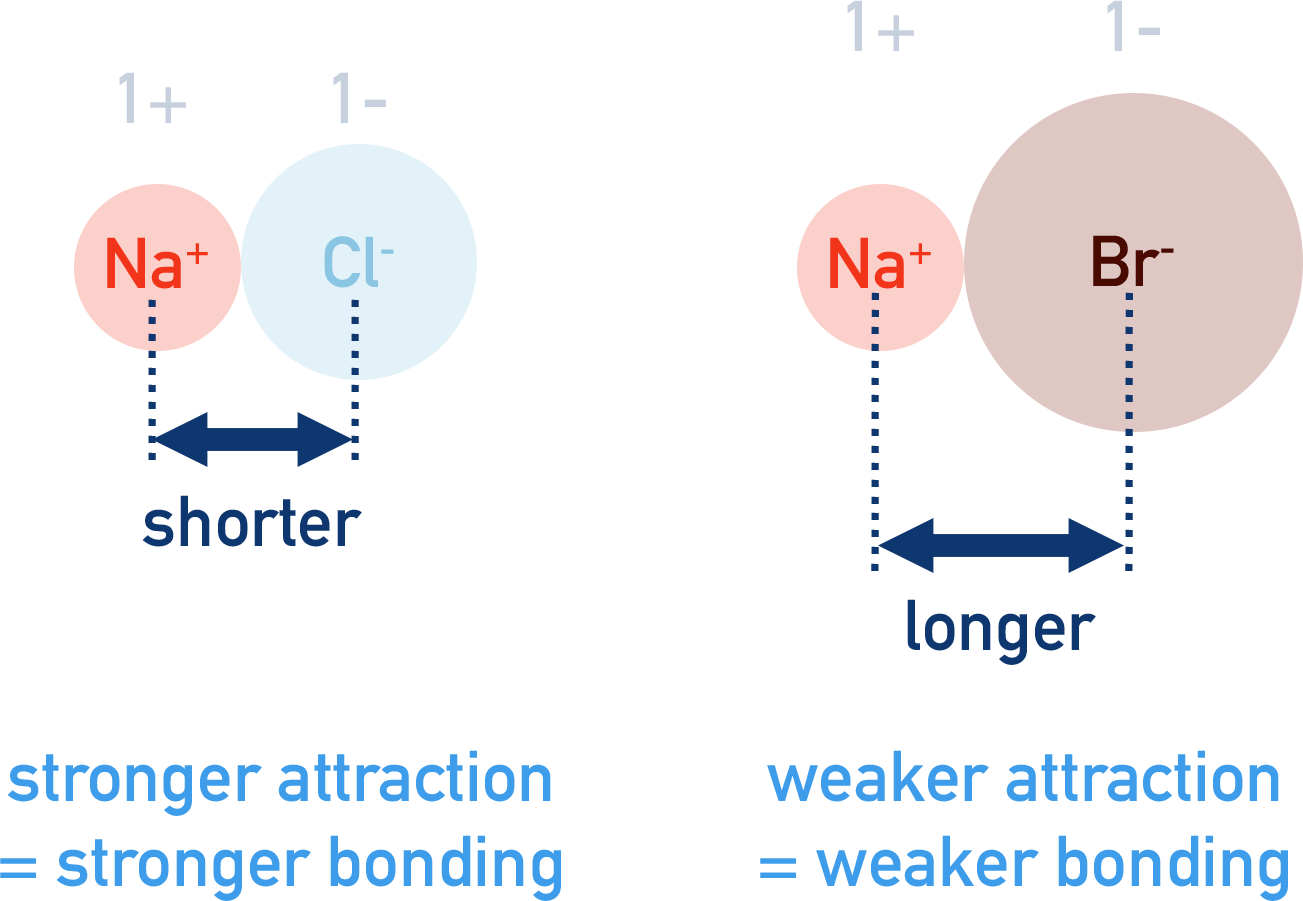 | Ion distance | Increase in distance | Attraction decreases |