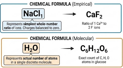 Chemical formulas show the ratio and type of atoms or ions in a compound.