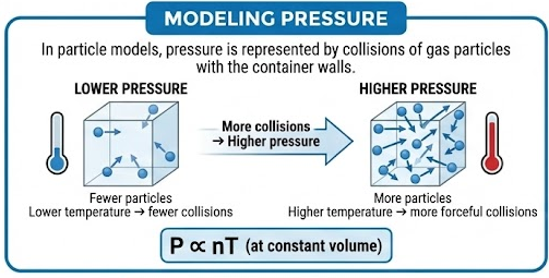 In particle models, pressure is represented by collisions of gas particles with the container walls.