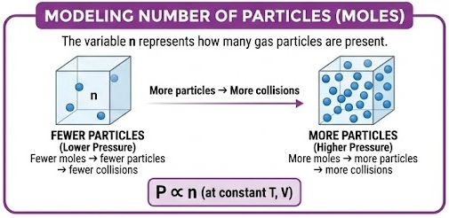 - Increasing \( \mathrm{n} \) increases pressure if volume and temperature stay constant