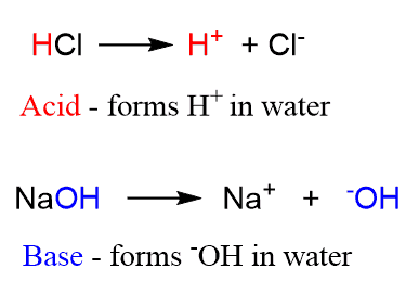 - Acid: produces \( \mathrm{H^+} \) (or \( \mathrm{H_3O^+} \)) in water