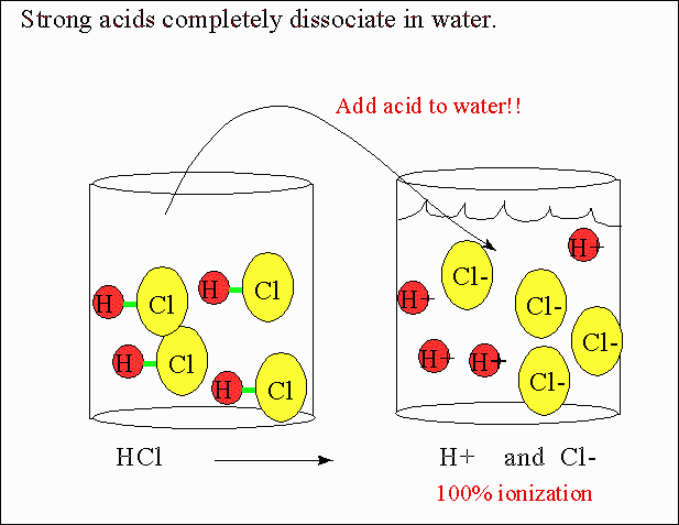 In particulate models, strong acids are shown as mostly ions dispersed in water.