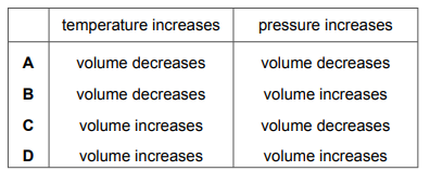 Which row describes how the volume of a gas changes when the temperature increases, or when the pressure increases?