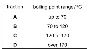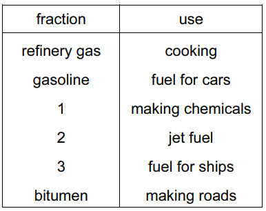 The table shows some fractions that are obtained from petroleum by fractional distillation, together with some of their uses.