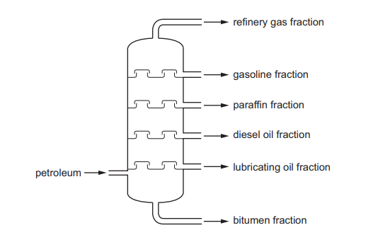 The diagram shows apparatus used to separate petroleum into four fractions.
