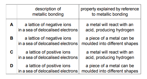 | B | Delocalised electrons can move freely through the structure. | Positive ions can move freely through the structure. |