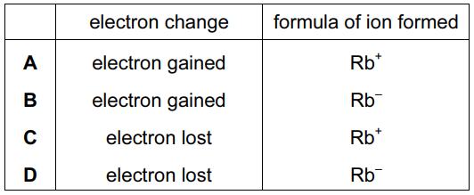 Which row shows the electron change taking place for rubidium and the correct formula of the rubidium ion?