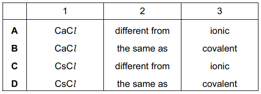 Cesium chloride has the formula ___ 1 ___ , a relative formula mass ___ 2 ___ that of rubidium bromide and bonds that are ___ 3 ___ .