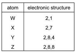 – W: 2,8,1 configuration (alkali metal – likely Na)