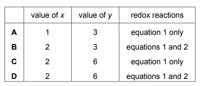 Which row shows the value of x, the value of y and the equations that are for redox reactions?