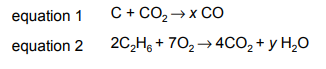 \[ \mathrm{C}_3 \mathrm{H}_8(\mathrm{g}) + \mathrm{xO}_2(\mathrm{g}) \rightarrow 3 \mathrm{CO}_2(\mathrm{g}) + \mathrm{yH}_2 \mathrm{O}(\mathrm{g}) \]