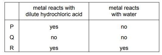 Four metals, P, Q, R and S, are added separately to water and to dilute hydrochloric acid.