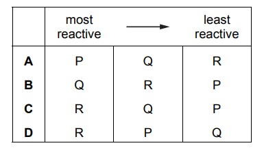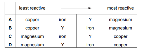 From the table: 1. Copper doesn’t displace any metal (least reactive). 2. Iron displaces only copper. 3. Metal Y displaces both iron and copper. 4. Magnesium displaces all three (most reactive). The correct order from least to most reactive is: Copper → Iron → Y → Magnesium.