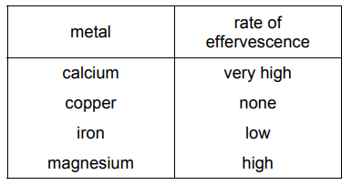 Four different metals are separately mixed with an equal volume of dilute hydrochloric acid. The table shows the rate of effervescence for each metal.