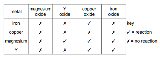 The table shows the results of separately heating four metals with oxides of different metals. The four metals are iron, copper, magnesium and Y. The results are shown.