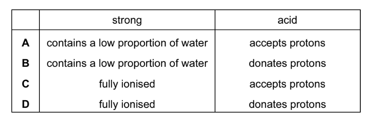 Concentrated hydrochloric acid is a strong acid. What is meant by the terms ‘strong’ and ‘acid’?