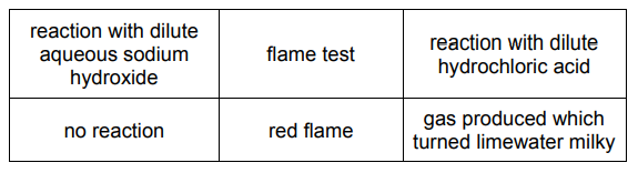 - B: Lithium carbonate matches all observations (red flame, CO2 production, no reaction with NaOH)