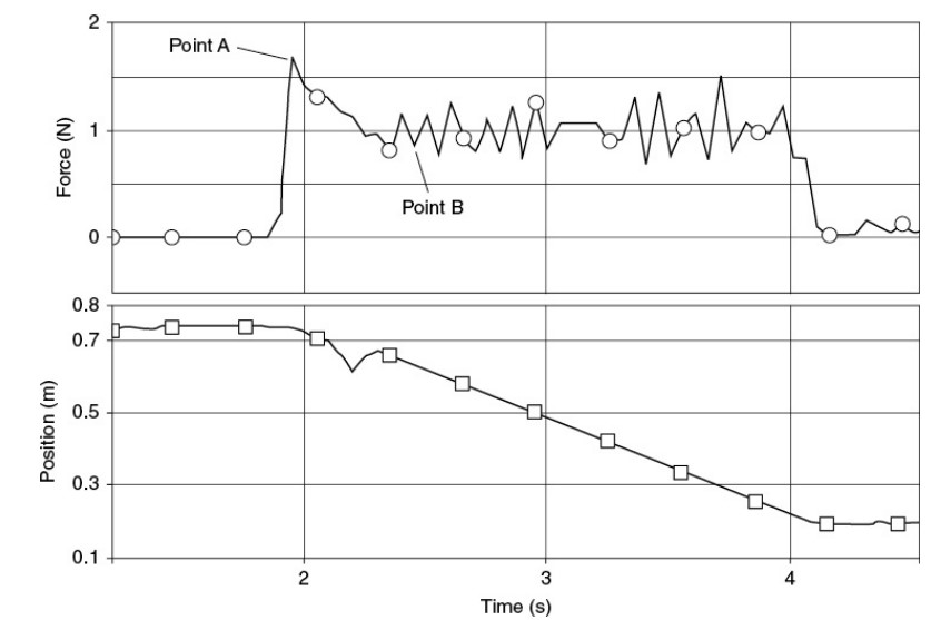 (a) Explain why the force reading marked point A on the graph is significantly different from the reading marked point B on the graph.