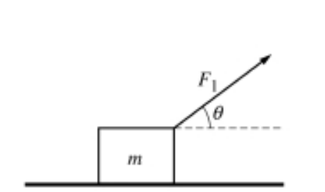 A block of mass m is pulled along a rough horizontal surface by a constant applied force of magnitude F1 that acts at an angle θ to the horizontal, as indicated above. The acceleration of the block is a1. Express all algebraic answers in terms of m, F1, θ , a1, and fundamental constants.