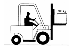 A 300-kg box rests on a platform attached to a forklift, shown above. Starting from rest at time = 0, the box is lowered with a downward acceleration of 1.5 m/s2