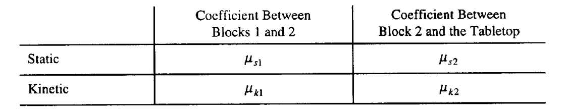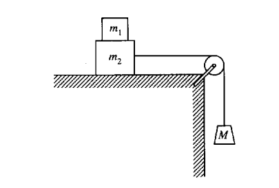 Block 1 of mass m1 is placed on block 2 of mass m2 which is then placed on a table. A string connecting block 2 to a hanging mass M passes over a pulley attached to one end of the table, as shown above. The mass and friction of the pulley are negligible. The coefficients of friction between blocks 1 and 2 and between block 2 and the tabletop are nonzero and are given in the following table.