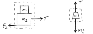 For the hanging block: Mg – T = Ma; For the two blocks on the plane: T – f2 = (m1 + m2)a Combining these equations (by adding them to eliminate T) and solving for a gives a = \(\left | \frac{M- \mu _{k2}\left ( m_{1}+m_{2} \right )}{M+m_{1}+m_{2}} \right |g\)
