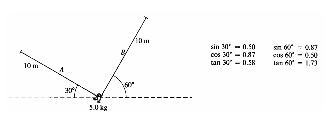 A 5.0-kilogram monkey hangs initially at rest from two vines, A and B. as shown above. Each of the vines has length 10 meters and negligible mass.