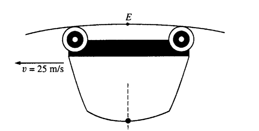 e. The car is at point E moving upside down with an instantaneous speed of 25 m/s and no tangential acceleration at the top of the vertical loop of radius 25 meters.