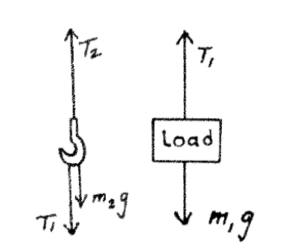 A crane is used to hoist a load of mass m1 = 500 kilograms. The load is suspended by a cable from a hook of mass m2 = 50 kilograms, as shown in the diagram above. The load is lifted upward at a constant acceleration of 2 m/s2.