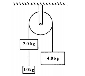 Three blocks of masses 1.0, 2.0, and 4.0 kilograms are connected by massless strings, one of which passes over a frictionless pulley of negligible mass, as shown above. Calculate each of the following.