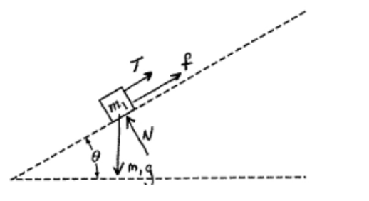 d. Applying Newton’s second law to block 1 gives \(\sum \) F = m1g sin θ – f = m1a which gives a = g sin θ – f/m1