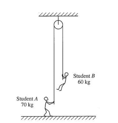 A rope of negligible mass passes over a pulley of negligible mass attached to the ceiling, as shown above. One end of the rope is held by Student A of mass 70 kg, who is at rest on the floor. The opposite end of the rope is held by Student B of mass 60 kg, who is suspended at rest above the floor. Use g = 10 m/s2.