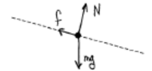 b. F can be resolved into two components: F sin θ acting into the incline and F cos θ acting up the incline. The normal force is then calculated with \(\sum \) F = 0; N – F sin θ – mg cos θ = 0 and f = μN Putting this together gives \(\sum \) F = ma; F cos θ – mg sin θ – μ(F sin θ + mg cos θ) = ma, solve for a
