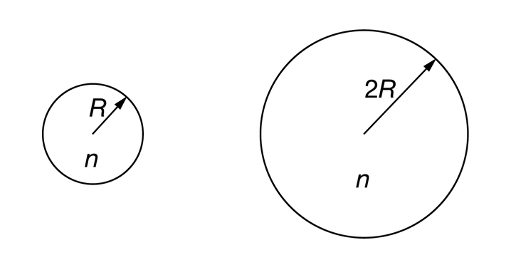 The second sphere is larger, and because the molecules have the same temperature, they have the same average speed. So, it takes a molecule longer to travel across the diameter of the sphere, and it hits the sphere wall less frequently than it would in the first sphere. That means less force; thus, less pressure is exerted on the second sphere.