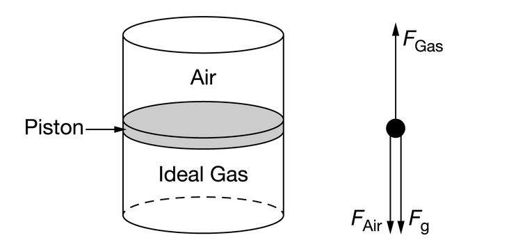 , so \(F_{gas}=(m_p+m_b)g\). Using Newton’s second law after the block is removed gives \(∑F_{after}=F_{gas}−W_{piston}=mp_a\), so \(a=\frac{F_{gas}−m_pg}{m_p}\). Substituting for \(F_{gas}\) gives \(a=\frac{(m_p+m_b)g−m_pg}{m_p}=\frac{m_b}{m_p}g\).