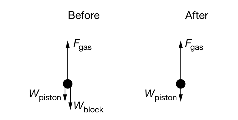 Using Newton’s second law before the block is removed gives \(∑F_{before}=F_{gas}−(W_{piston}+W_{block})=0\)