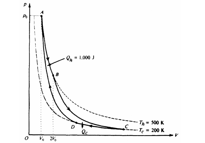 d. In a reversible (Carnot) engine \(\frac{Q_{H}}{Q_{C}} = \frac{T_{H}}{T_{C}} \) giving Qc = 400 J