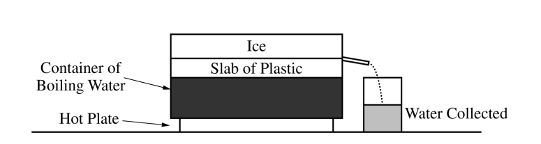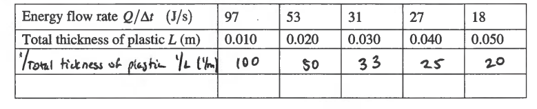 A group of students use the apparatus shown above to determine the thermal conductivity of a certain type of plastic. A hot plate is used to keep water in a container boiling at a temperature of 1000 C . They place a slab of the plastic with area 0.025 m2 and thickness 0.010 m above the container so that the bottom surface of the slab is at a temperature of 1000 C . They put a large block of ice with temperature 00 C on top of the plastic slab. Some of the ice melts, and the students measure the amount of water collected during a time Δt . The students correctly calculate the amount of energy Q delivered to the ice and thus determine Q /Δt . They repeat this experiment several times, each time adding an identical slab to increase the total thickness L of plastic. Their results are shown in the table below.