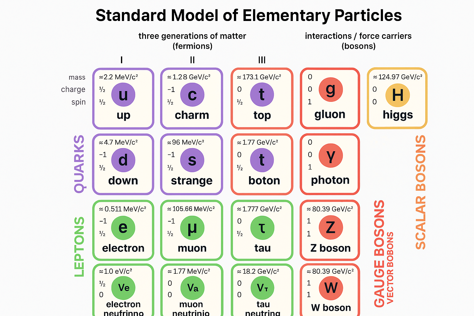 The Standard Model is often presented in a table, with rows, columns, and colorcoded sections used to group subsets of particles according to their properties.