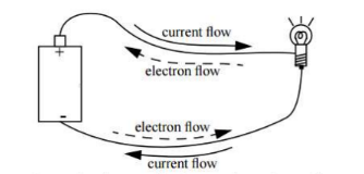 Current from high electrical potential (positive charge) to low electrical potential (negative charge). - In a solid conductor, current is due to the flow of free electrons. As electrons are negatively charged, they are attracted to flow towards positive charge. However, in circuit analysis, we pretend that current is due to the flow of positive charge in the opposite direction of electron movement. This is called conventional current.